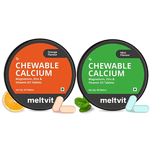 Meltvit Chewable Calcium Tablets 1000Mg With Vitamin D3, Magnesium & Zinc Tablets | Water Soluble Calcium Citrate Malate 1000Mg With Stabilised D3 - Orange & Mint Flavour Combo - 60 Tablets Each. (Pack Of 2) is available on Amazon at best discounted online price. MRP of this product is ₹ 1150.0. You can buy this product at discounted rate ₹ 499.0.