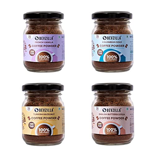 Bevzilla 50 Grams X 4 Flavoured Instant Coffee Powder Pack Of Colombian Gold, Turkish Hazelnut, French Vanilla & English Butterscotch | Strong Coffee| 100% Arabica Instant Coffee is available on Amazon at best discounted online price. MRP of this product is ₹ 1999.0. You can buy this product at discounted rate ₹ 375.0.
